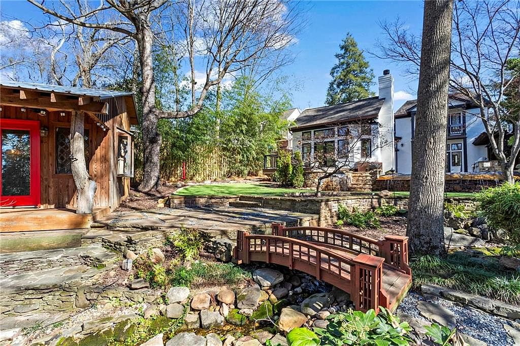 This serene backyard area features a charming wooden footbridge arching over a small naturalistic pond lined with rocks. The landscape is terraced with stone retaining walls, supporting lush greenery and mature trees. To the left, a rustic wooden structure with a bold red door adds warm, inviting contrast against the natural tones of weathered wood and stone. The house in the background boasts large windows and a white exterior with dark trim, blending classic and modern styles. The overall environment reflects a thoughtful integration of natural materials and landscaping, creating a peaceful outdoor retreat.