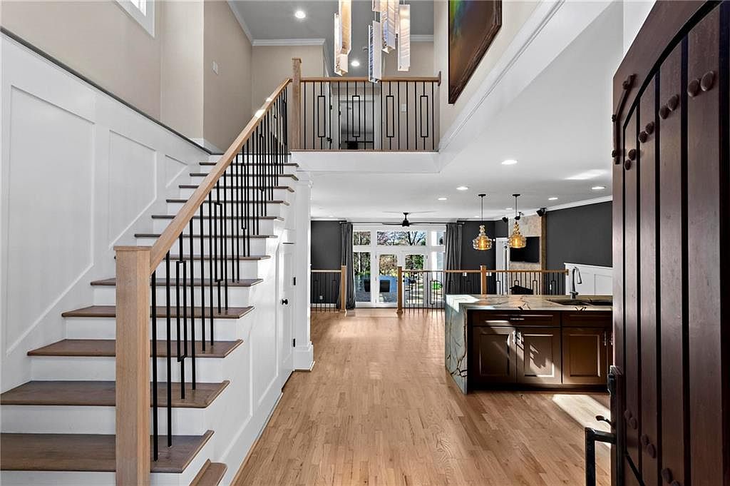 This open-concept space features a bright and welcoming entryway with natural light streaming in from high windows. The flooring is a warm-toned hardwood that extends throughout, enhancing the airy, expansive feel. A staircase with wooden steps, white risers, and black vertical metal balusters leads to an upper landing with matching railing, adding vertical interest. The kitchen island, made of rich dark wood cabinetry with a light marbled countertop, offers a sophisticated contrast to the otherwise neutral walls and ceiling. Pendant lights above the island add warmth and stylish illumination. The far wall showcases large glass doors that open to the outside, connecting indoor and outdoor living with abundant natural light. The clean lines, mix of wood and metal details, and neutral palette create a contemporary yet cozy atmosphere in this transitional space.