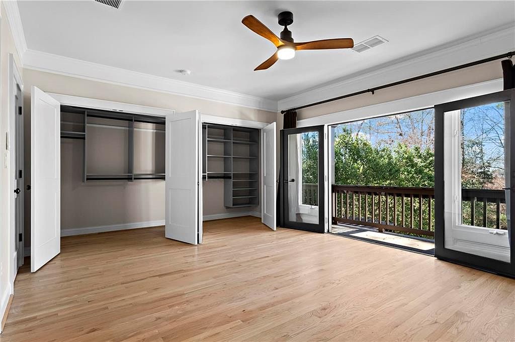 This spacious bedroom features light, natural wood flooring that harmonizes with the soft neutral wall colors, evoking a calm and airy ambiance. Two white double-door closets with built-in shelving and hanging rods provide ample and organized storage. A sleek ceiling fan with wooden blades is mounted centrally, enhancing comfort and modern style. Large black-framed French doors open widely to a private balcony with a dark wood railing, seamlessly blending indoor and outdoor living while allowing natural light to flood the room. The overall aesthetic is clean, contemporary, and inviting.