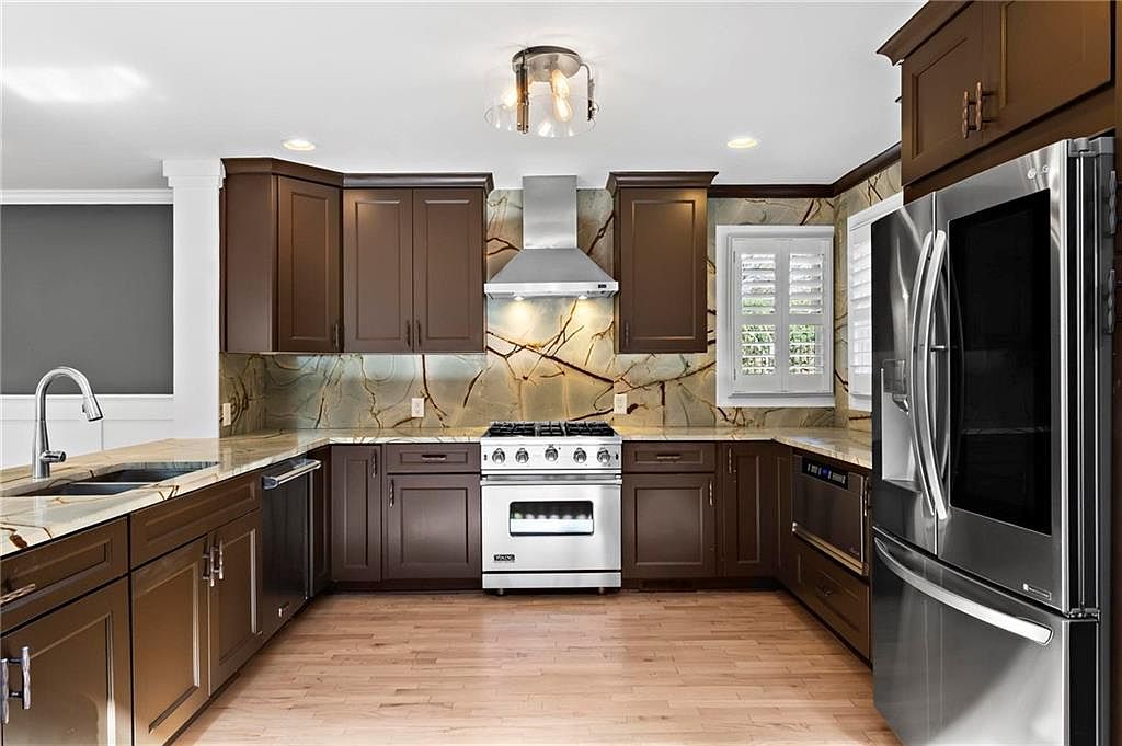 This kitchen features an L-shaped layout with ample dark brown cabinetry that creates a warm, sophisticated atmosphere. The cabinetry includes both upper and lower storage, with modern silver handles complementing the sleek finish. A striking marble backsplash with natural veining extends from the countertop to the upper cabinets, adding a luxurious texture and visual interest. The countertops mirror this marble design, tying the space together. Stainless steel appliances, including a large double-door refrigerator and a modern range with a hood, provide a contemporary contrast. Light wood flooring and a simple ceiling light fixture complete the crisp yet inviting aesthetic.