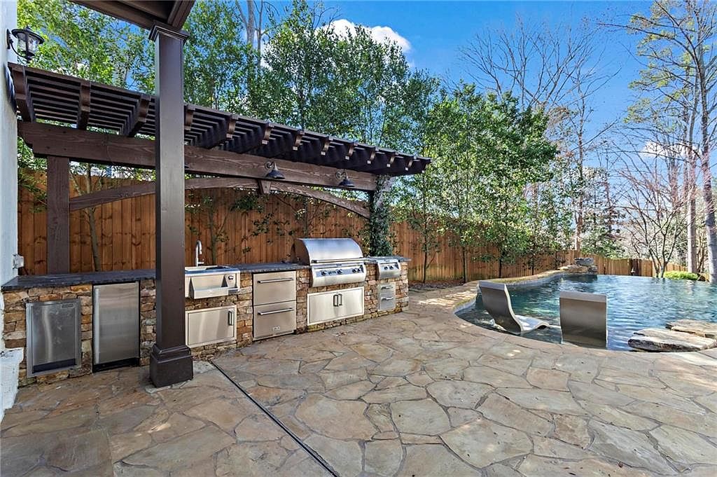 This outdoor living space is designed for both relaxation and entertainment, featuring a built-in kitchen under a dark wood pergola that provides partial shade. The kitchen area boasts stainless steel appliances including a grill, refrigerator, and storage drawers, accentuated by a stone facade that blends rustic charm with modern functionality. The flagstone flooring continues throughout the area, complementing the natural stone texture. Adjacent to the kitchen is a curved infinity pool with submerged loungers, surrounded by mature trees and a wooden fence, creating a private, tranquil oasis under a clear blue sky.