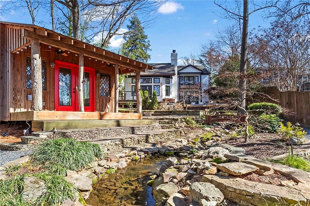 This serene backyard area blends natural elements with charming rustic design. A small wooden cabin with vibrant red double doors stands prominently, supported by thick tree-trunk posts and topped with an angled wood roof. Stone steps lead down to a shallow, clear stream bordered by large flat rocks, integrating water naturally into the landscape. Lush greenery and carefully placed shrubs add vibrant life amid the stone and wood, while the main house in the background contrasts with a modern white facade and large windows. The overall aesthetic offers a peaceful, nature-inspired outdoor space perfect for relaxation and reflection.