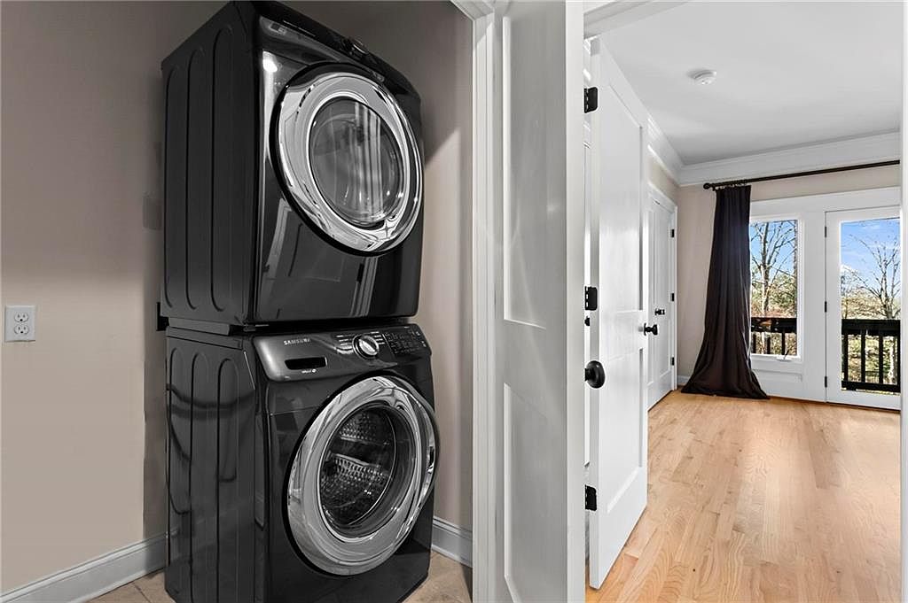 A compact laundry nook features a modern, sleek black stackable washer and dryer set, framed neatly within a light beige wall alcove. Beside it, white paneled double doors with black hardware open into a room with warm, natural wood flooring that extends to a small balcony area beyond glass doors. The room is brightened by natural light streaming through large windows draped with elegant dark curtains, creating a subtle contrast against the neutral walls and white trim. This functional yet inviting transitional space combines utility with airy openness, highlighted by thoughtful finishes and clean lines.