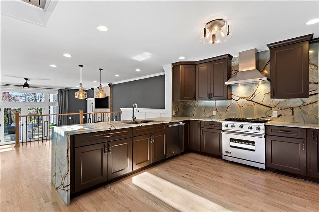 This spacious kitchen features a sleek design with rich dark cabinetry complemented by striking marble countertops and backsplashes that display natural veining patterns. The layout includes a large island with an undermount sink and modern fixtures, offering both functionality and style. Warm wood flooring harmonizes beautifully with the cabinetry, bringing warmth to the space. Stainless steel appliances, including a prominent stove with a vent hood, provide a modern touch. The kitchen opens up to an adjacent living area with ample natural light streaming through large windows, enhanced by recessed lighting and elegant pendant lights, creating an inviting, contemporary atmosphere.