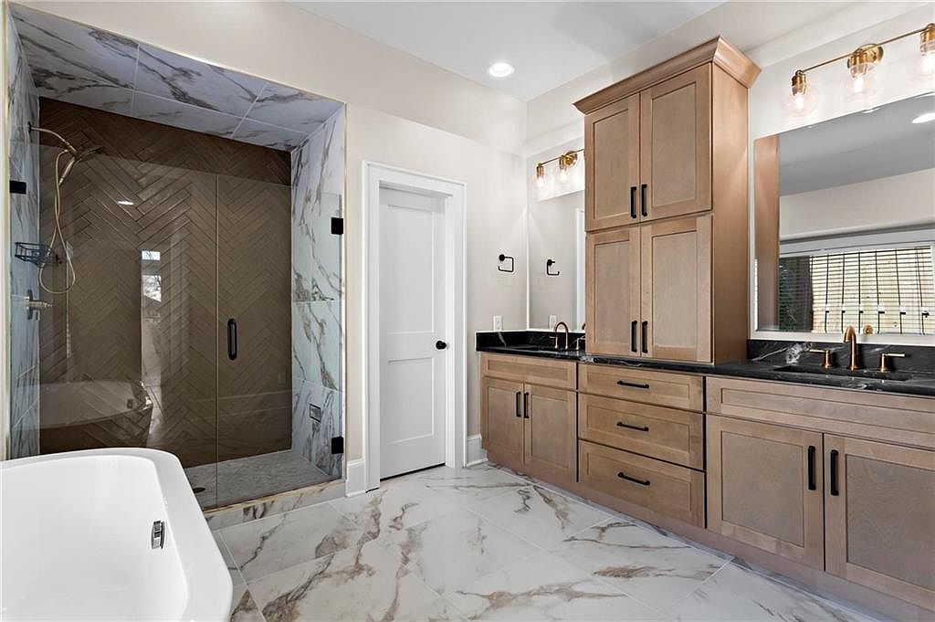 This spacious master bathroom features a sleek, modern aesthetic with a neutral color palette dominated by soft beige cabinetry and striking black granite countertops. The vanity extends along the wall with ample storage including drawers and cabinets, and a tall center cabinet offers additional space. Above the vanity, large mirrors are bordered by sophisticated light fixtures with exposed bulbs and a brushed brass finish, adding warmth and elegance. The floor is covered in large marble tiles with subtle gray veining, complementing the marble-patterned shower surround and contrasting beautifully with the herringbone brown tile inside the glass-enclosed shower. A modern freestanding white bathtub is partly visible, enhancing the luxurious feel of the room.