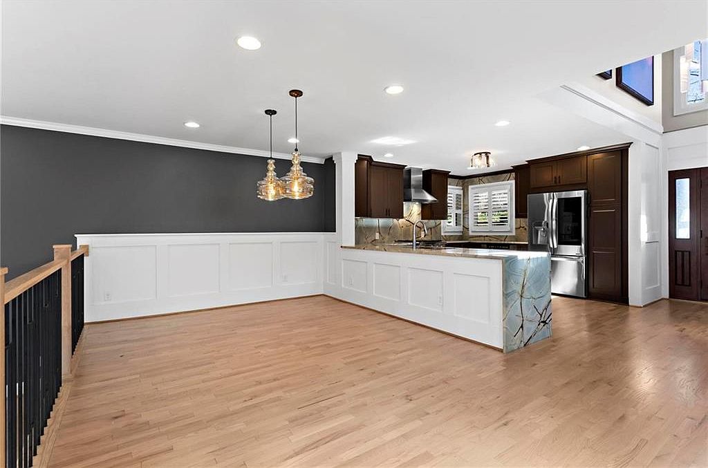 This spacious open-concept kitchen and dining zone features warm wood flooring that seamlessly flows throughout the space. The kitchen is equipped with rich dark cabinetry, creating a striking contrast against white wainscoting and a dramatic charcoal gray accent wall. A large island with paneled detailing and a unique light marble countertop serves as a central focal point, also incorporating a stylish waterfall edge with delicate veining. Modern stainless steel appliances and a range hood add a sleek touch, while overhead recessed lighting and two glass pendant lights provide illumination. The airy, inviting ambiance blends classic elements with contemporary style.