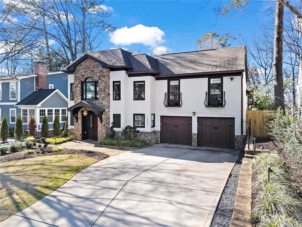 This charming home combines classic and modern elements with its white stucco walls contrasted by dark trim and a stone facade around the entryway, creating a rustic yet refined aesthetic. The front entrance features a small covered porch with a pitched roof supported by stone columns. Black-framed windows provide clean lines and allow ample natural light inside. The dual wooden garage doors with subtle decorative hardware add warmth to the exterior. The curved driveway is bordered by manicured landscaping, including neatly trimmed shrubs and a blend of grass and mulched planting beds, enhancing the home’s welcoming curb appeal.