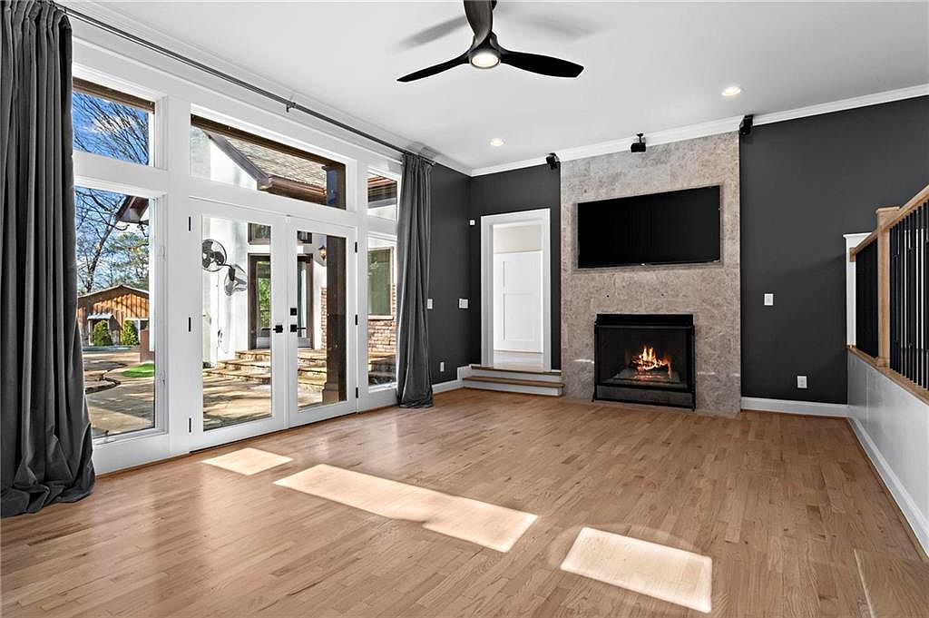 This spacious living room features a modern and inviting atmosphere characterized by a sleek, dark gray accent wall that frames a stone fireplace. Above the fireplace is a mounted flat-screen TV, enhancing the room’s functional appeal. Natural light floods the space through expansive white-framed glass doors and side windows, connecting the interior to an outdoor patio and garden area. Light hardwood floors add warmth and contrast with the darker walls, while a black ceiling fan adds both style and airflow. Long, dark curtains provide flexibility for light control and privacy. Subtle recessed lighting and spotlights complete the contemporary look.