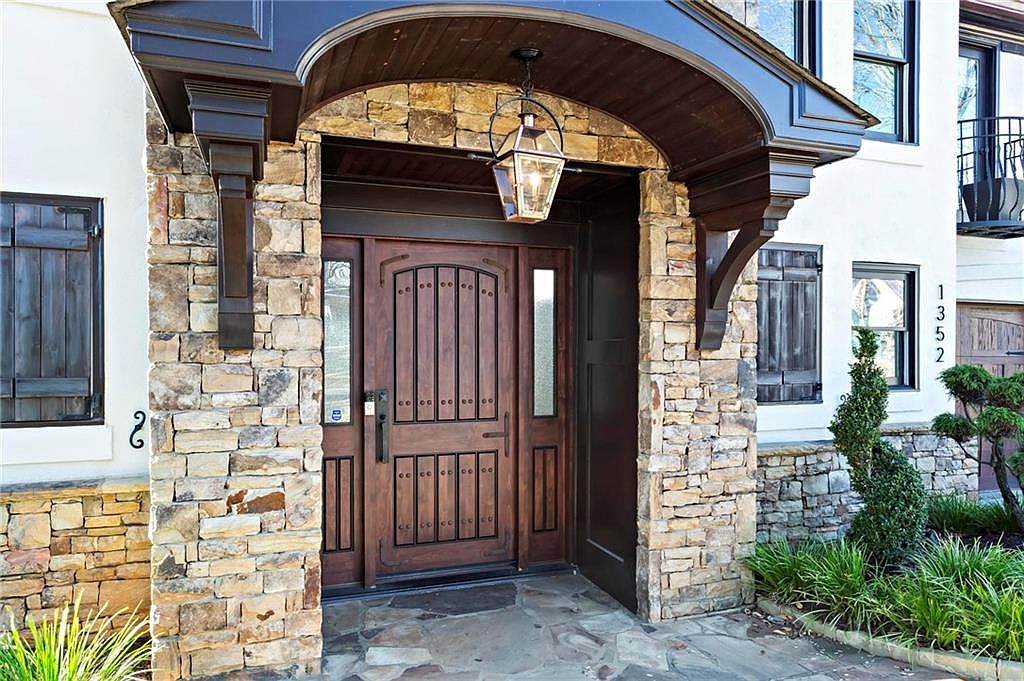 This charming front entryway features a warm and inviting wooden door with decorative metal studs that lends a rustic touch. Flanked by narrow sidelights with frosted glass, the door is set within a robust stone archway showcasing natural textures in beige and tan tones. The porch ceiling is clad in rich, dark wood, complementing the sturdy wooden corbels that support the elegant curved canopy above. A classic lantern-style light fixture hangs centrally, adding to the welcoming atmosphere. Surrounding stonework extends partially along the exterior walls, while neatly trimmed greenery and shrubs border the walkway, enhancing the home’s timeless curb appeal.