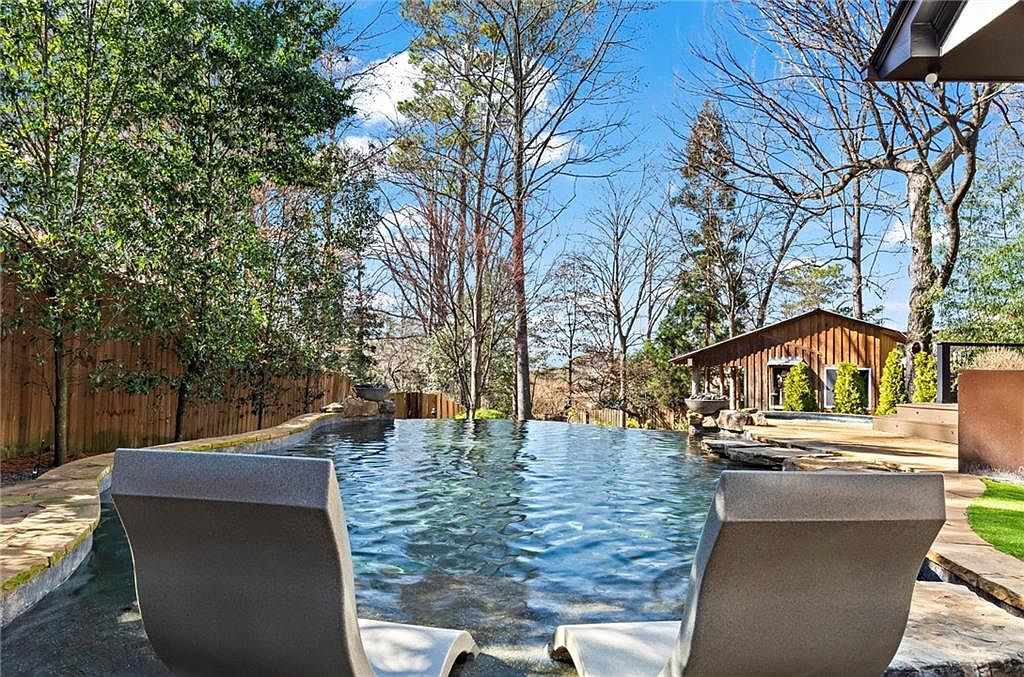 This tranquil backyard space centers around a sleek infinity pool, blending seamlessly with the natural landscape. Two modern chaise lounges partially submerged at the pool’s edge invite relaxation while offering a perfect view of the surrounding serene trees and blue sky. The pool is bordered by natural stone edging, enhancing its organic feel. A wooden fence and mature greenery provide privacy, while a rustic wood outbuilding adds charming, functional appeal to the far side. The combination of the clear water, wood elements, and lush greenery creates a calm, inviting outdoor retreat perfect for unwinding or entertaining.