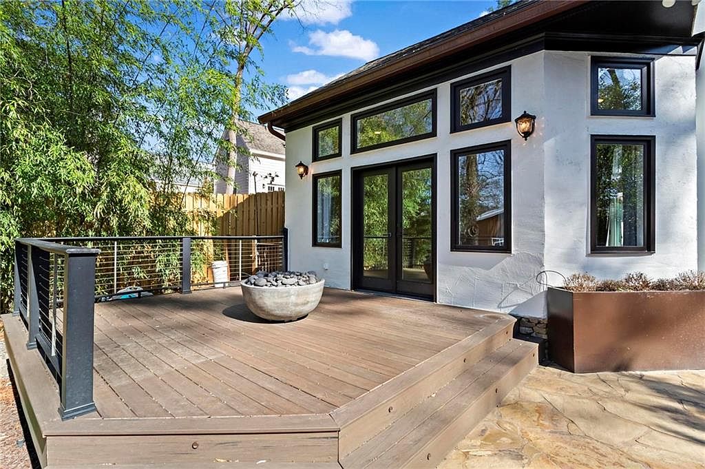 This outdoor deck space shows a modern yet inviting environment with warm brown wooden flooring complemented by sleek black metal railing accented with clean horizontal cables. The deck is slightly elevated, accessible by a few wide wooden steps, creating an intimate transition from the natural stone patio below. Large glass doors and multiple windows in black frames bring abundant natural light into the adjacent interior, while the white exterior walls offer a fresh, crisp contrast. Wall-mounted lantern-style lights flank the doors, enhancing evening ambiance. A contemporary firepit bowl with river stones sits centrally, surrounded by lush green bamboo and other plants, blending nature with modern design.