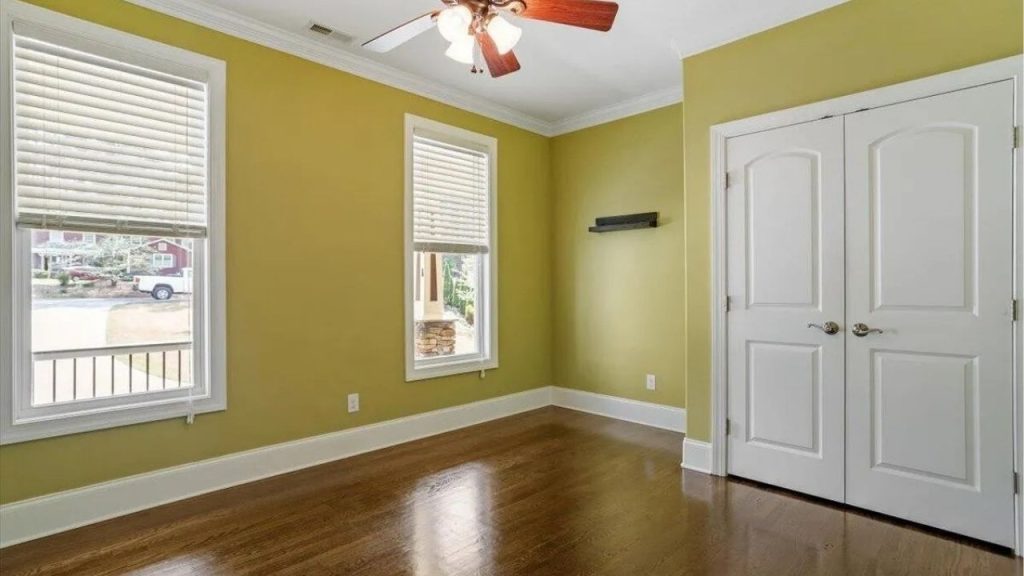 This inviting room strikes a balance between simplicity and charm. Natural light pours in through twin front-facing windows, highlighting the warm honey-toned hardwood floors. A crisp white double-door closet adds functional elegance, while the subtle olive walls offer a soft, earthy backdrop. Crown molding and a ceiling fan with wood-toned blades complete the space, blending comfort with classic style.