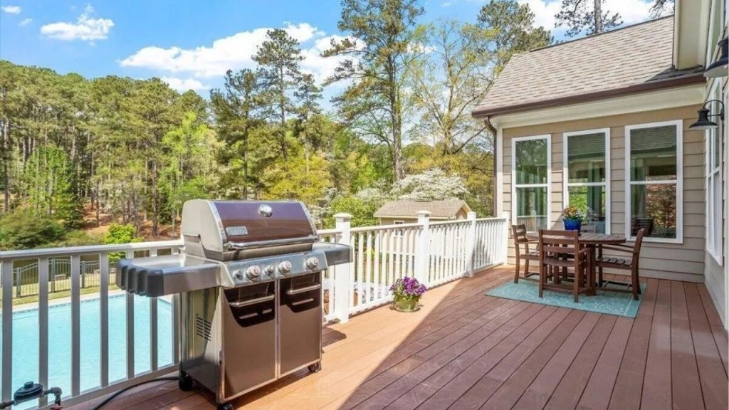 Perfect for alfresco dining and weekend grilling, this spacious deck extends an invitation to unwind. Rich wood planks and crisp white railings frame the space, while a sleek stainless grill promises summer barbecues. A cozy outdoor dining set rests atop a woven rug, flanked by vibrant potted blooms. Beyond, a backdrop of towering pines and a glistening pool below complete the serene, private escape.