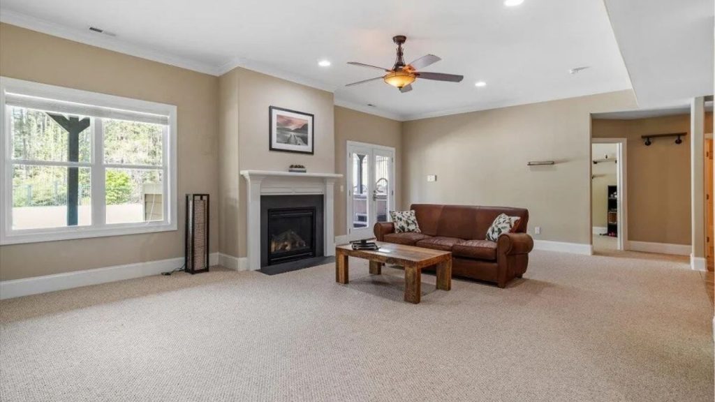 This generous living area blends comfort and versatility with ease. A neutral palette and plush carpet create a relaxed foundation, while the crisp white trim adds definition. Anchoring the room, a sleek fireplace with a classic mantel brings warmth and character. Natural light streams through oversized windows, and a leather sofa paired with a rustic coffee table makes for an inviting setting to gather or unwind.