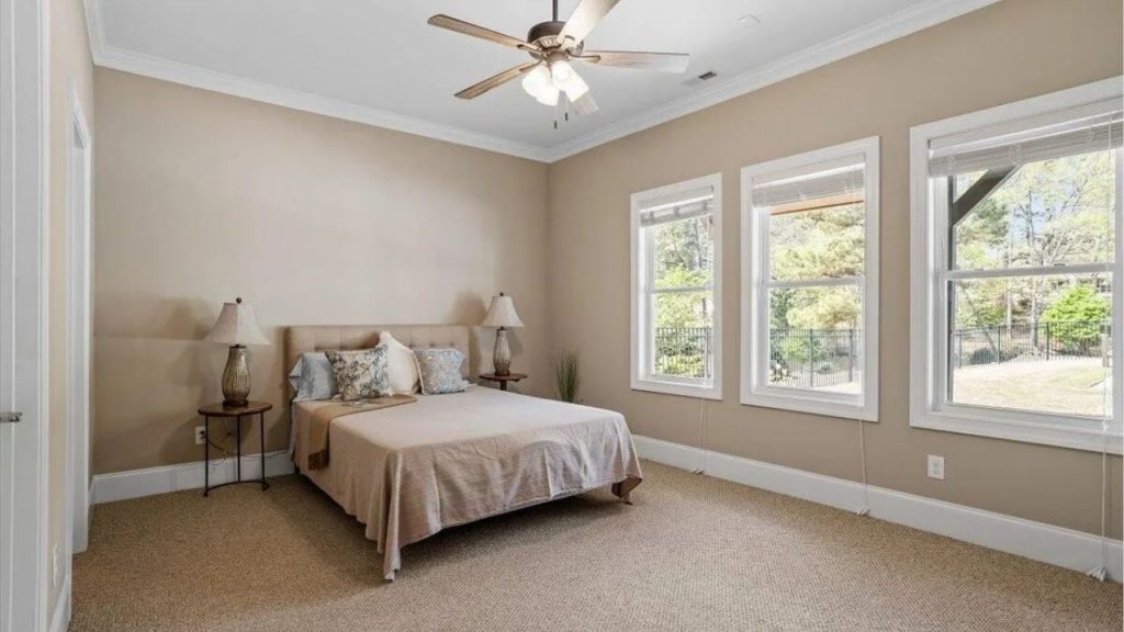 This tranquil bedroom offers a soothing retreat with its soft beige walls and plush carpeting. A trio of large windows floods the space with natural light, framing peaceful views of the outdoors. The neutral-toned bed with floral accent pillows sits between two matching lamps, adding symmetry and charm. A ceiling fan with warm wood blades enhances comfort while preserving the room’s airy, relaxed feel.