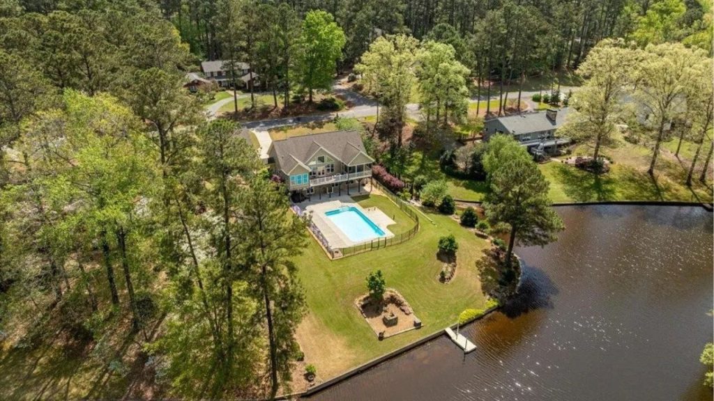 Nestled among mature trees and bordered by a tranquil lake, this expansive property offers a rare blend of privacy and luxury. A sparkling pool serves as the backyard centerpiece, surrounded by manicured lawns and a spacious patio ideal for entertaining. The home’s elevated deck provides sweeping views of the water and lush grounds, while a private dock invites peaceful moments by the shoreline.
