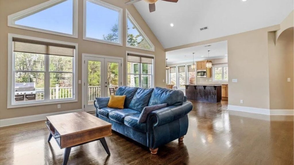 Bathed in natural light, this inviting great room features soaring vaulted ceilings and a striking wall of windows that frame serene outdoor views. The open layout flows seamlessly into the kitchen, ideal for entertaining or everyday comfort. Rich hardwood floors and soft neutral tones create warmth, while French doors offer easy access to the deck. A balance of elegance and ease defines this bright, welcoming space.