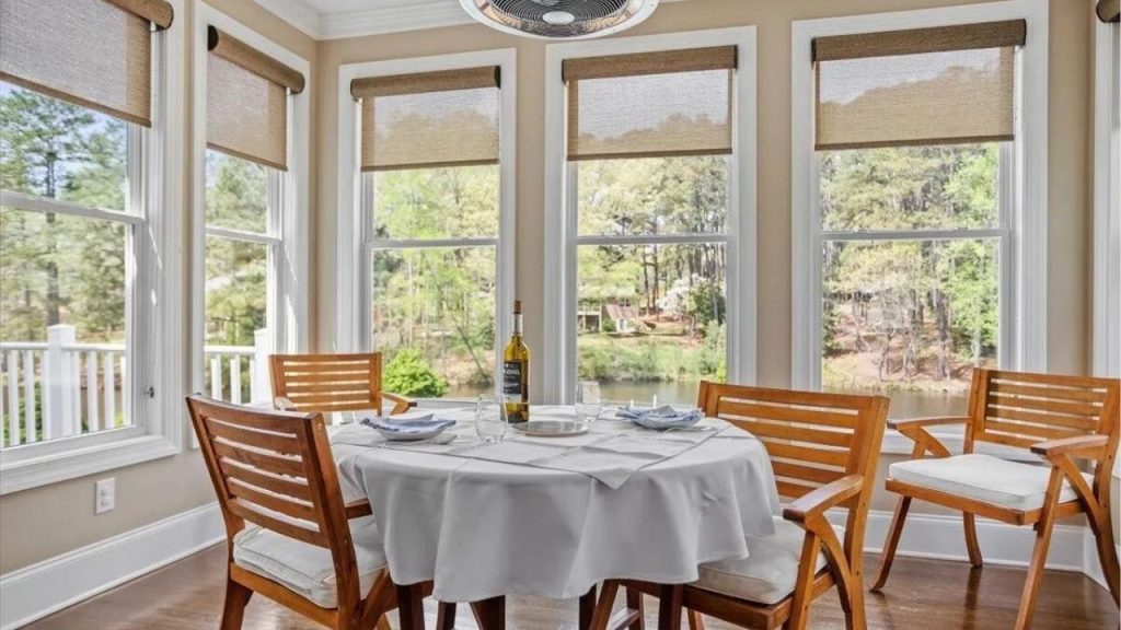 This charming breakfast nook captures the beauty of the outdoors with a wrap of tall windows that frame a tranquil lakeside setting. Natural light pours in, highlighting the soft neutral walls and crisp white trim. A round table with wooden chairs invites leisurely mornings or intimate meals, while woven shades add texture and privacy. The space blends comfort and nature, offering a serene start to any day.