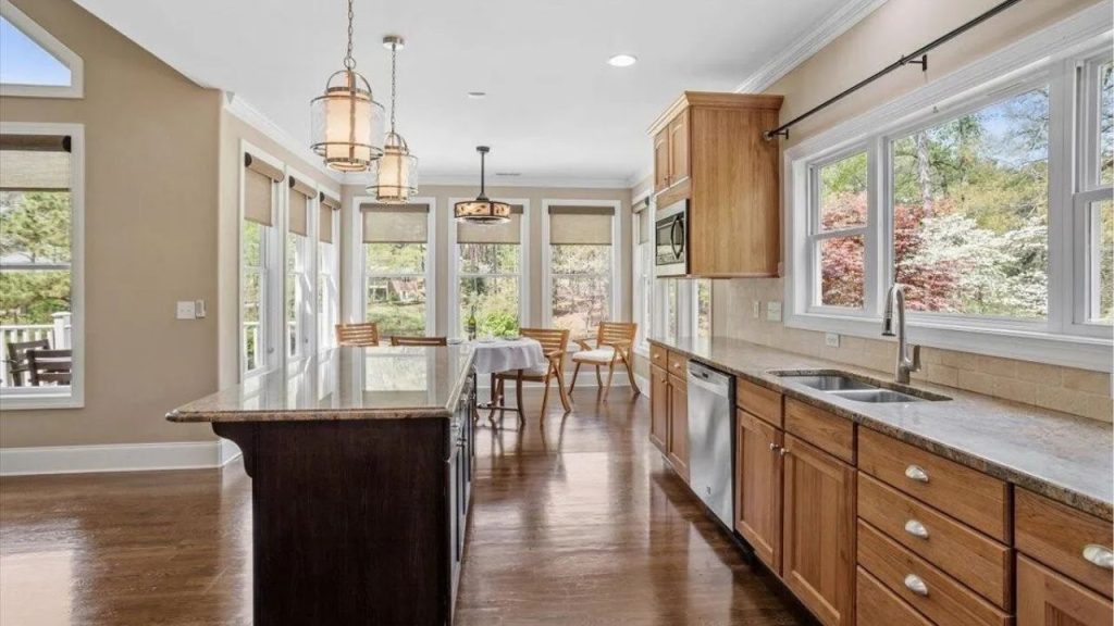 This inviting kitchen blends classic charm with modern comfort, featuring honey-toned cabinetry and granite countertops that stretch along a full wall of windows. Natural light floods the space, highlighting the polished wood floors and airy layout. A central island with dark wood contrast anchors the room, while pendant lighting adds a soft, elegant glow. The cozy breakfast nook offers serene garden views—perfect for morning coffee.