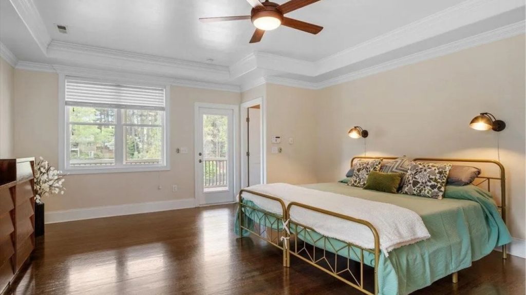 Calm and inviting, this spacious primary suite offers a restful retreat with warm hardwood floors and soft neutral walls. A tray ceiling and modern fan add architectural interest, while wall-mounted sconces provide cozy bedside lighting. The gold metal bed frame lends a touch of vintage flair, complemented by rich textiles and layered pillows. A private door leads to the outdoors, blurring the line between comfort and nature.
