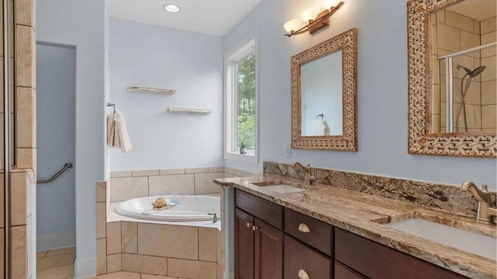 This serene bathroom blends elegance and relaxation with its soft blue walls and natural light. The granite double vanity features rich wood cabinetry and ornate mirrors that add warmth and detail. A corner soaking tub invites quiet moments, framed by neutral tile and a peaceful window view. Subtle touches—like floating shelves and warm brass fixtures—complete the space with quiet sophistication.