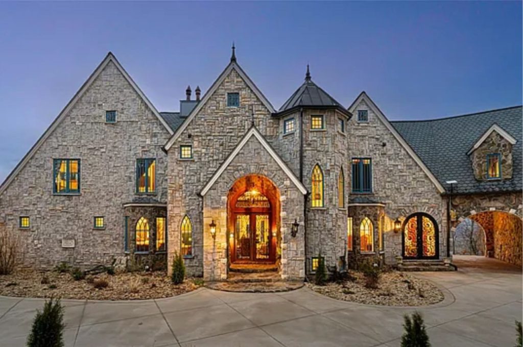 This striking stone estate channels storybook charm with its steeply pitched gables, arched windows, and turreted tower. The intricate stonework, accented by warm interior lighting, adds a sense of grandeur and timelessness to the facade. Elegant wooden double doors beneath a vaulted stone entry create a welcoming focal point, while wrought iron details and gothic-style windows further the old-world allure. A curved driveway and arched porte-cochère enhance the home’s castle-like presence, making it feel both majestic and inviting. Every architectural element feels handcrafted to transport you to a romantic European countryside escape.