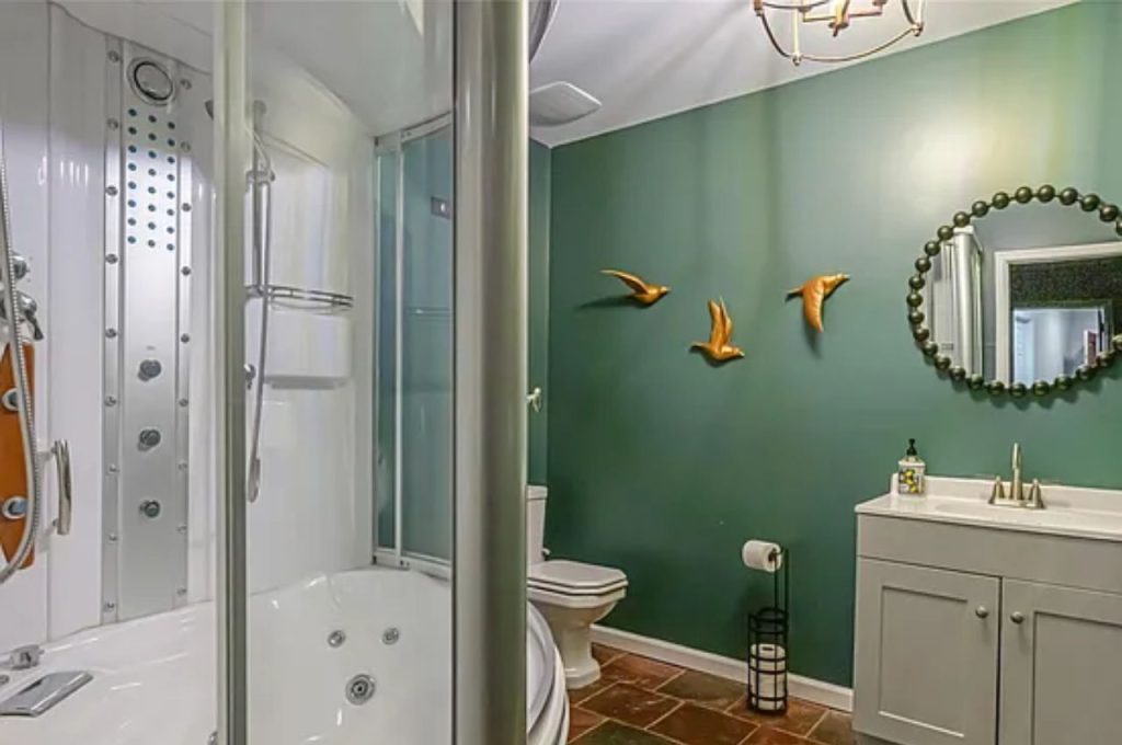 This beautifully styled bathroom brings spa-like relaxation home with its unique blend of modern and rustic elements. A multi-functional steam shower and jetted tub combination offers the ultimate in luxury bathing. The forest green accent wall sets a calming tone, adorned with golden bird sculptures that add a whimsical, artistic flair. A sleek white vanity with brushed nickel fixtures sits beneath a round beaded mirror, enhancing the contemporary aesthetic. Terracotta-toned tile flooring grounds the space with warmth and texture, creating a serene and inviting retreat.