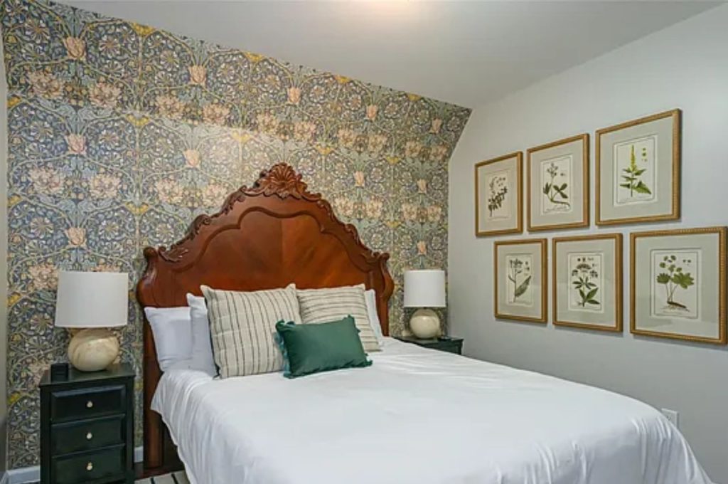 This cozy bedroom feels like a nod to English cottage style, blending classic elegance with natural warmth. The focal point is the ornate carved headboard, which adds a regal touch against the intricate floral wallpaper that wraps the back wall in vintage character. Framed botanical prints enhance the garden-inspired theme, offering a soft and cohesive palette of greens and earth tones. Paired with modern black nightstands and rounded ceramic lamps, the space finds a sweet balance between antique and updated. Plush pillows in varied textures complete the inviting look, perfect for a restful retreat steeped in timeless style.