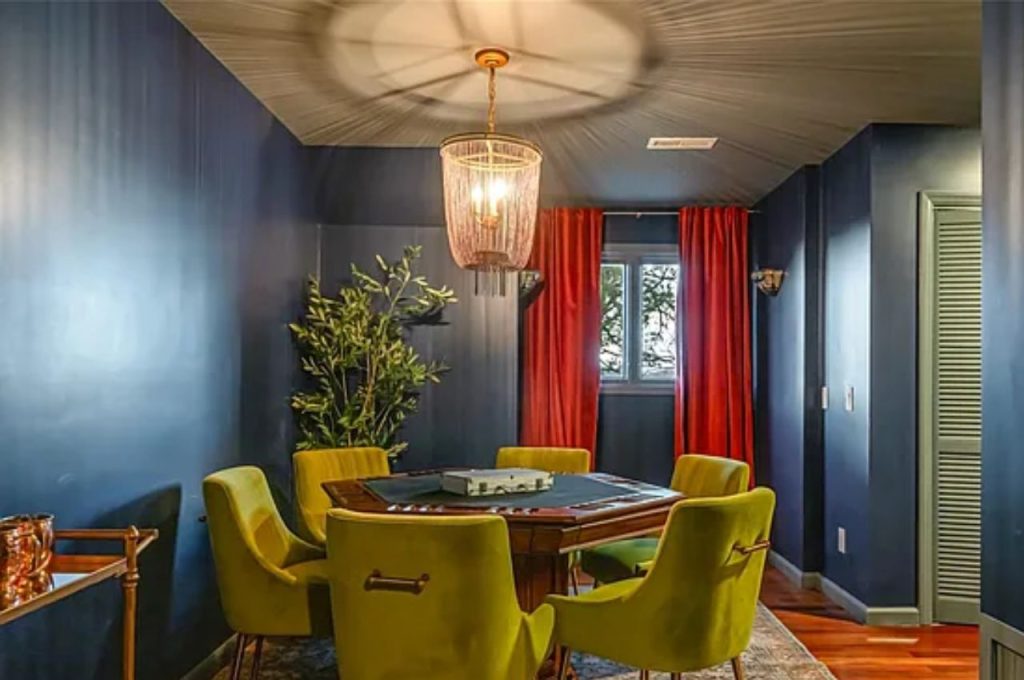 This dramatic game room delivers a rich, immersive vibe with its deep navy walls and ceiling, setting the stage for bold, colorful accents. The lime green velvet chairs offer a fun contrast around a classic poker table, instantly energizing the space. Vibrant red curtains frame the window with a theatrical flair, while the sculptural pendant light casts artistic shadows that amplify the moody ambiance. A touch of greenery adds life to the room, softening the darker palette. With its combination of luxe textures and vibrant tones, this space invites lively gatherings and late-night card games in high style.