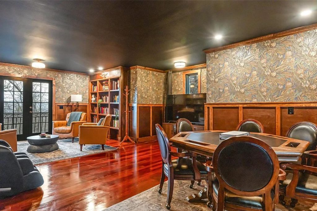 Blending leisure and function, this elegant den transitions seamlessly between a cozy reading nook and a refined game room. The lounge area remains anchored by leather armchairs and built-in bookshelves, while the opposite side introduces a stately card table surrounded by traditional leather chairs—ideal for poker nights or strategic board games. The dark ceiling and richly toned wood paneling continue throughout, reinforcing the room’s cohesive charm. Floral wallpaper adds organic warmth, and the glossy hardwood floors bring a polished foundation to the space. It’s a sophisticated retreat where both quiet escapes and lively gatherings feel right at home.