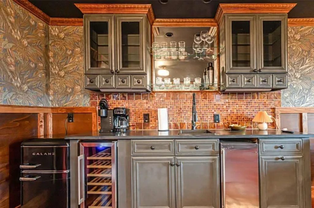 This wet bar combines vintage charm with rich, modern detailing to create a standout focal point. Olive-toned cabinetry with glass-paneled uppers adds timeless elegance, while copper-toned mosaic tiles bring warmth and a touch of glam to the backsplash. A sleek black faucet and dark countertops add contrast, complemented by a mirrored open shelf that beautifully showcases glassware. Below, a Galanz mini fridge, wine cooler, and additional stainless drawer fridge deliver both form and function. Paired with the floral wallpaper and crown molding, this compact bar becomes a luxurious amenity ideal for entertaining or everyday indulgence.