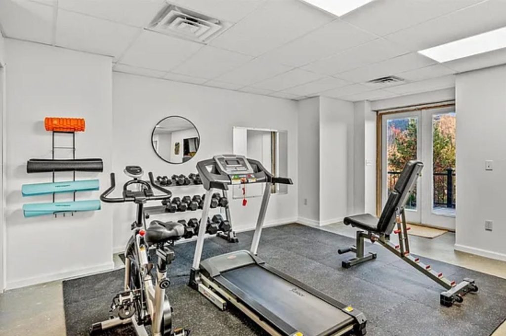 This well-appointed home gym offers a sleek and motivating environment for fitness enthusiasts. Natural light pours in through the glass doors, creating an airy atmosphere that feels fresh and energizing. The space is outfitted with essential equipment including a treadmill, stationary bike, adjustable bench, and a full rack of dumbbells, ideal for both cardio and strength training. Wall-mounted storage keeps foam rollers and yoga mats neatly organized, while a round mirror enhances depth and functionality. Rubber flooring provides support and shock absorption, rounding out a workout space that’s both practical and stylish for daily wellness routines.