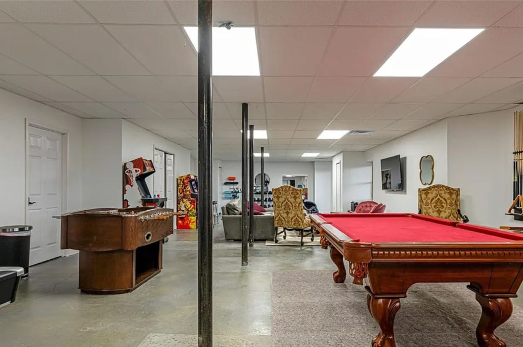 This dynamic basement transformation is the ultimate entertainment hub for both casual hangouts and competitive fun. A rich red felt pool table takes center stage, paired with ornate vintage-style chairs that lend a touch of classic charm. Along the wall, mounted cue racks keep equipment neatly organized. The space also features arcade machines, a foosball table, and a mounted TV, providing options for all kinds of play. Just beyond, a cozy seating area and peek into the home gym hint at the room’s multi-purpose appeal. Bright overhead lighting and polished concrete floors round out a space designed for both relaxation and recreation.
