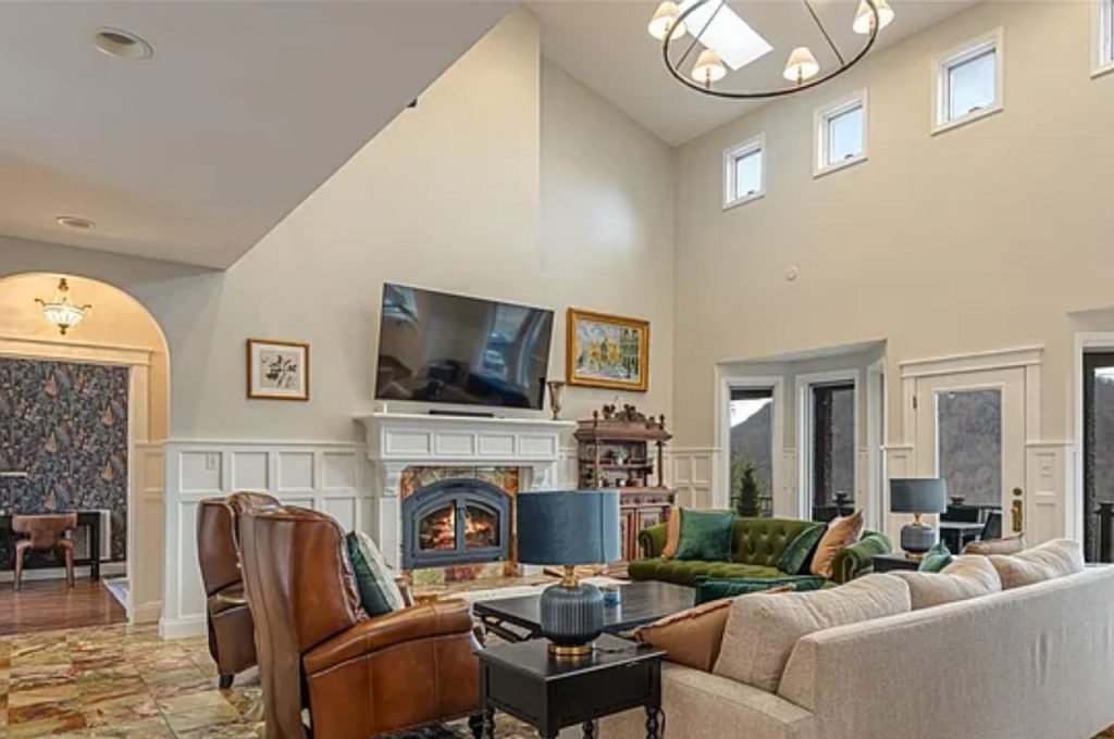 This grand living room blends timeless charm with modern comforts. Soaring ceilings, a statement chandelier, and high clerestory windows flood the space with natural light. A white-paneled fireplace anchors the room beneath a mounted TV, while plush seating in rich earth tones and velvet accents offer sophistication and warmth. The space flows effortlessly toward the outdoor patio through French doors, creating an inviting atmosphere perfect for entertaining or relaxing by the fire.