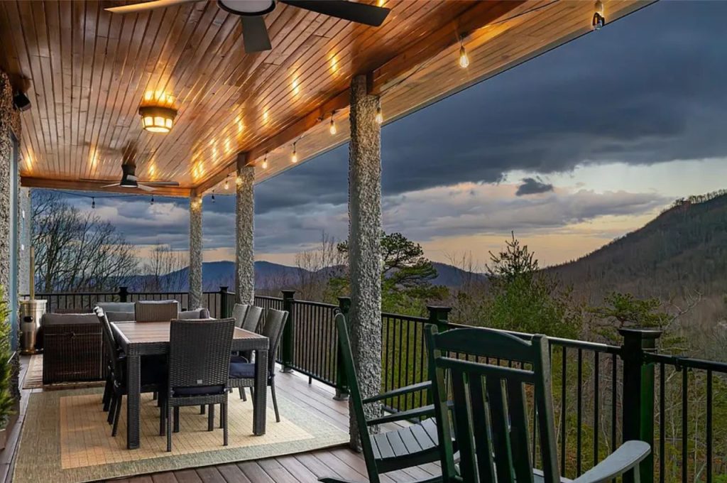 This breathtaking covered deck is a front-row seat to nature’s ever-changing canvas. With sweeping views of the mountains and a sky that transforms with the hour, the space invites you to unwind and stay a while. A warm wood-paneled ceiling with string lights and statement fixtures creates a cozy glow as evening settles in. Black railing and stone-wrapped columns offer a touch of rustic elegance, while the wicker dining set and classic rocking chairs provide comfort for both meals and moments of reflection. Whether it’s morning coffee or sunset conversations, this outdoor retreat delivers tranquility with a view.