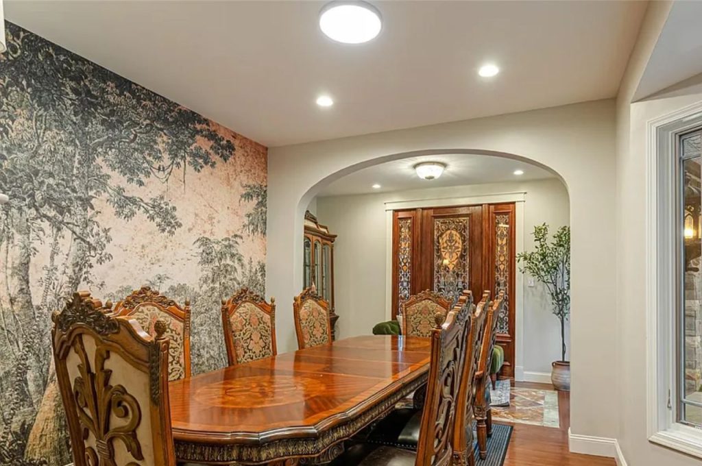 This exquisite formal dining room is a celebration of craftsmanship and old-world charm. The richly detailed wood table and ornate high-back chairs create an air of grandeur, perfect for hosting memorable gatherings. A hand-painted mural wall adds a timeless, romantic backdrop, while the arched doorway leads into a space framed by carved wooden cabinetry and subtle lighting. The blend of textures and tones makes this room both stately and warm.