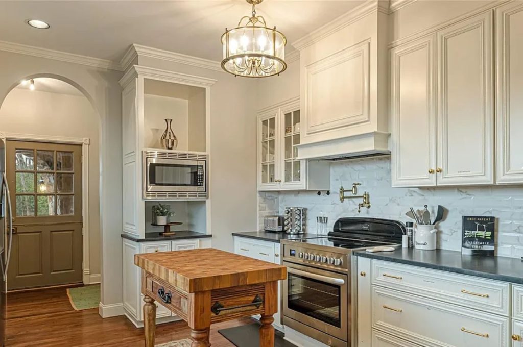 Blending vintage character with modern efficiency, this charming kitchen offers a gourmet experience in a refined setting. Custom cream cabinetry with intricate molding pairs beautifully with brass hardware and a crisp marble-style backsplash. A standout butcher block island adds rustic appeal and functionality. The sleek stainless steel appliances and pot filler enhance culinary convenience, while soft pendant lighting and hardwood floors complete the warm, elegant ambiance.