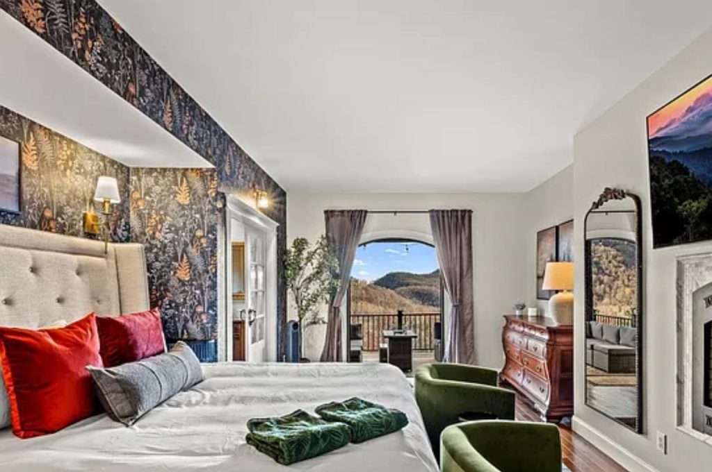 This elegant master bedroom seamlessly blends comfort and character with a stunning view. A bold botanical wallpaper frames the plush upholstered headboard, while jewel-toned accent pillows and green velvet chairs add rich, cozy touches. Natural light floods in through the arched doorway leading to a private balcony, offering sweeping mountain views. A fireplace with a mounted TV, full-length mirror, and classic wood dresser enhance both functionality and charm in this serene, thoughtfully styled retreat.