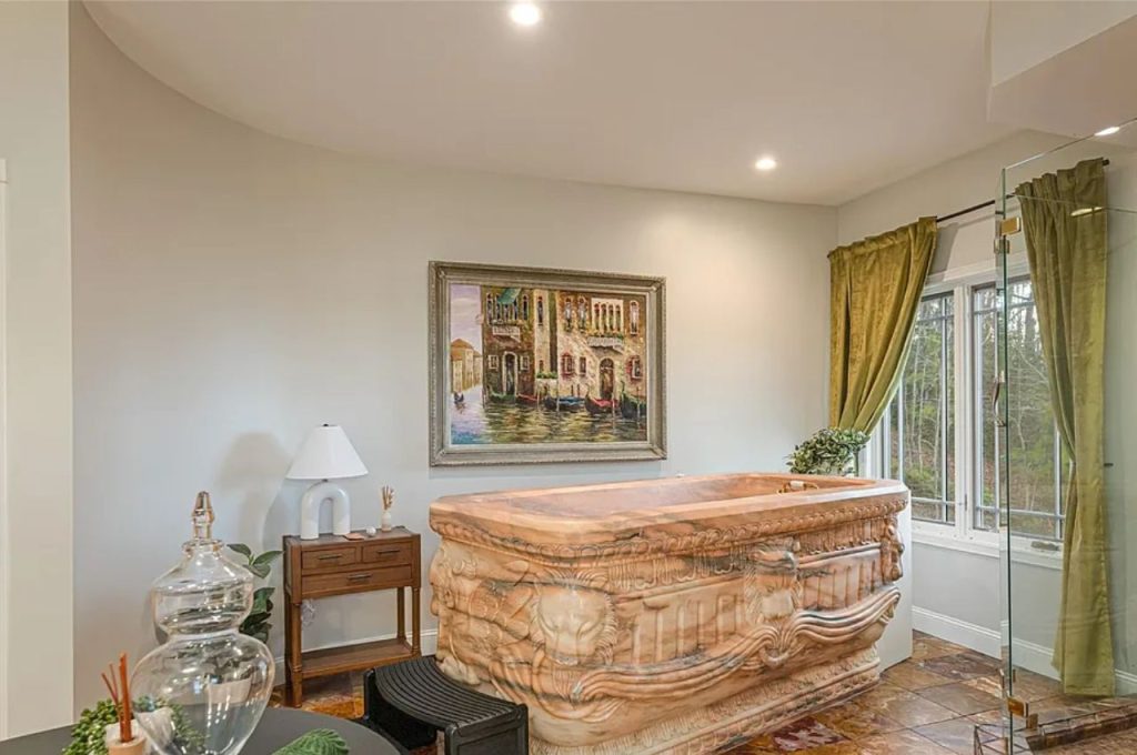 This luxurious bathroom stuns with a sculptural stone soaking tub that feels more like a Renaissance masterpiece than a modern fixture. Carved with intricate classical details, the tub takes center stage against a calming backdrop of neutral walls and a large scenic painting. Earth-toned tile floors and natural light streaming through the window create a tranquil, organic ambiance. A glass shower, green velvet curtains, and elegant decor elements complete the space, offering a one-of-a-kind retreat designed for pure relaxation.