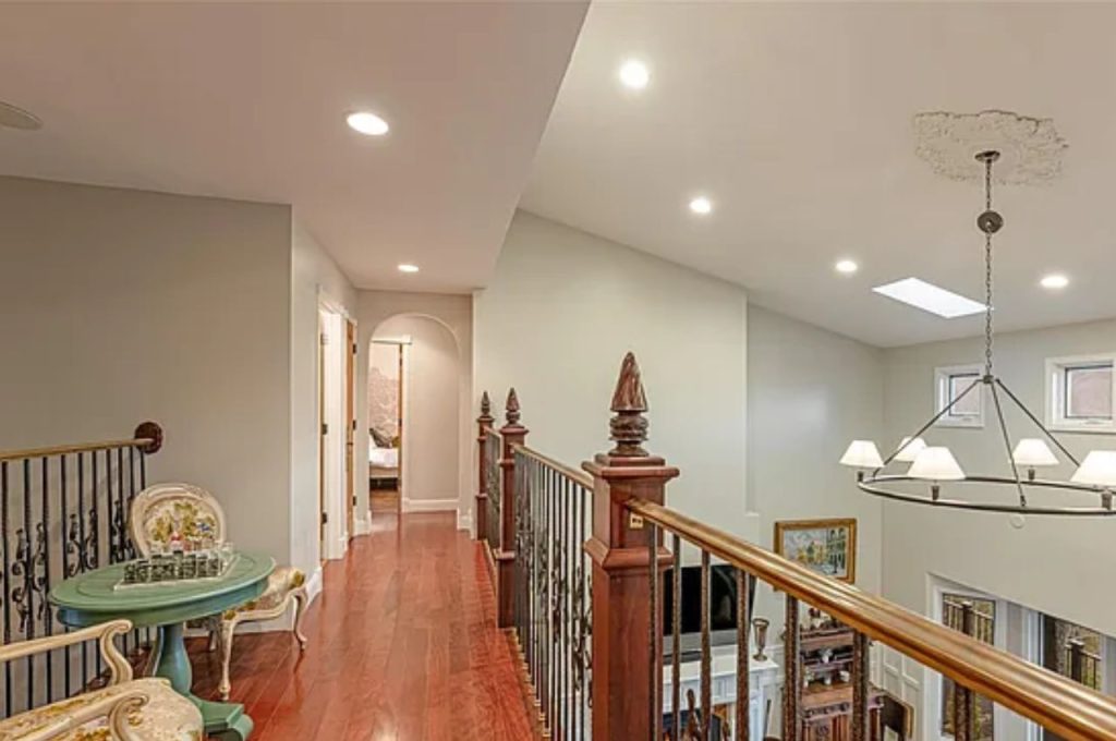 This charming upper hallway blends classic sophistication with modern lighting and open-concept design. The polished wood floors gleam under recessed ceiling lights and a skylight that fills the space with natural light. Ornate iron balusters and carved wood posts elevate the railing, while a quaint sitting nook with floral-upholstered chairs and a painted chess table invites quiet moments. An arched doorway adds architectural interest, guiding you toward the cozy bedroom beyond. This transitional space offers both beauty and function in perfect balance.