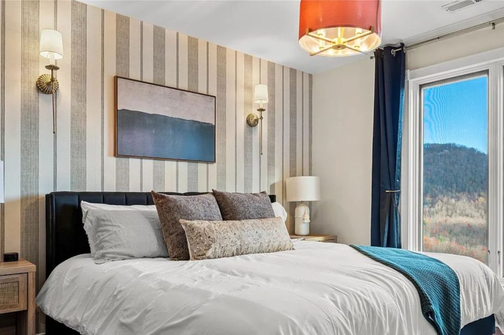 This cozy bedroom invites rest with a soothing palette and plush textiles. Vertical striped wallpaper adds dimension and height to the space, complemented by a minimalist abstract painting. A black tufted headboard anchors the bed, layered with neutral pillows and a soft blue throw. Warm bedside lighting, along with a contemporary ceiling fixture, casts a gentle glow, while floor-length navy curtains frame stunning mountain views just outside the window. This space blends comfort and style for a truly serene retreat.