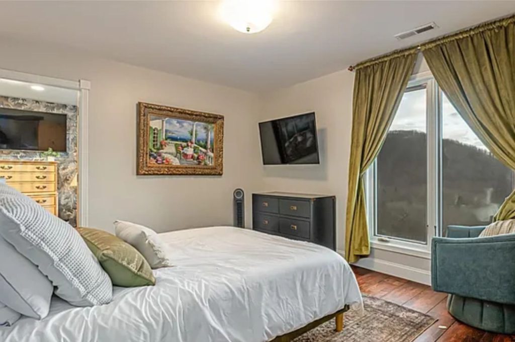 This room offers a perfect balance of comfort and charm, ideal for peaceful overnight stays. A plush bed layered with crisp white linens and accent pillows sits beneath a softly glowing ceiling light. Floor-to-ceiling windows framed by gold drapes flood the space with natural light and showcase serene mountain views. A rich blue armchair in the corner adds a cozy reading nook, while a mounted TV provides entertainment. Decorative touches like the landscape painting and dark dresser with gold pulls lend the room a timeless, elegant feel.