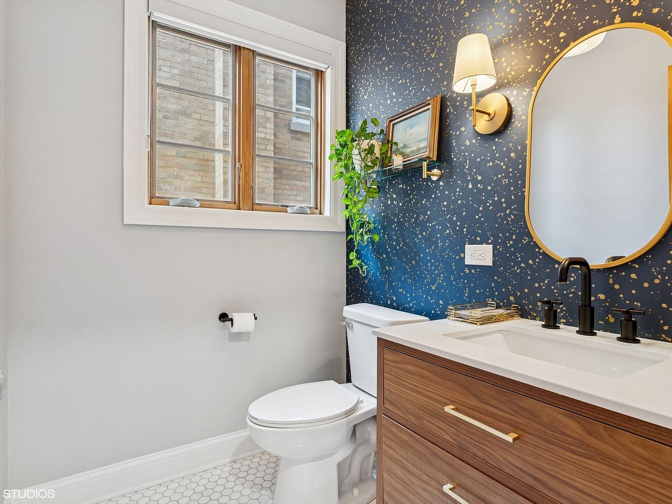 This bathroom features a modern aesthetic with a combination of sleek and warm elements. The vanity showcases rich wood cabinetry with horizontal gold handles, topped with a smooth white countertop housing a rectangular undermount sink. Matte black fixtures, including a three-piece faucet set, add a contemporary contrast. The wall behind the vanity is a standout with navy blue wallpaper accented by a gold speckled pattern, creating a luxurious focal point. A gold-framed oval mirror and wall sconce with a white shade enhance the elegance. A small floating shelf holds a green hanging plant and framed art, complementing the natural light streaming through the multi-pane window. White hexagonal floor tiles add subtle pattern and texture to the space.