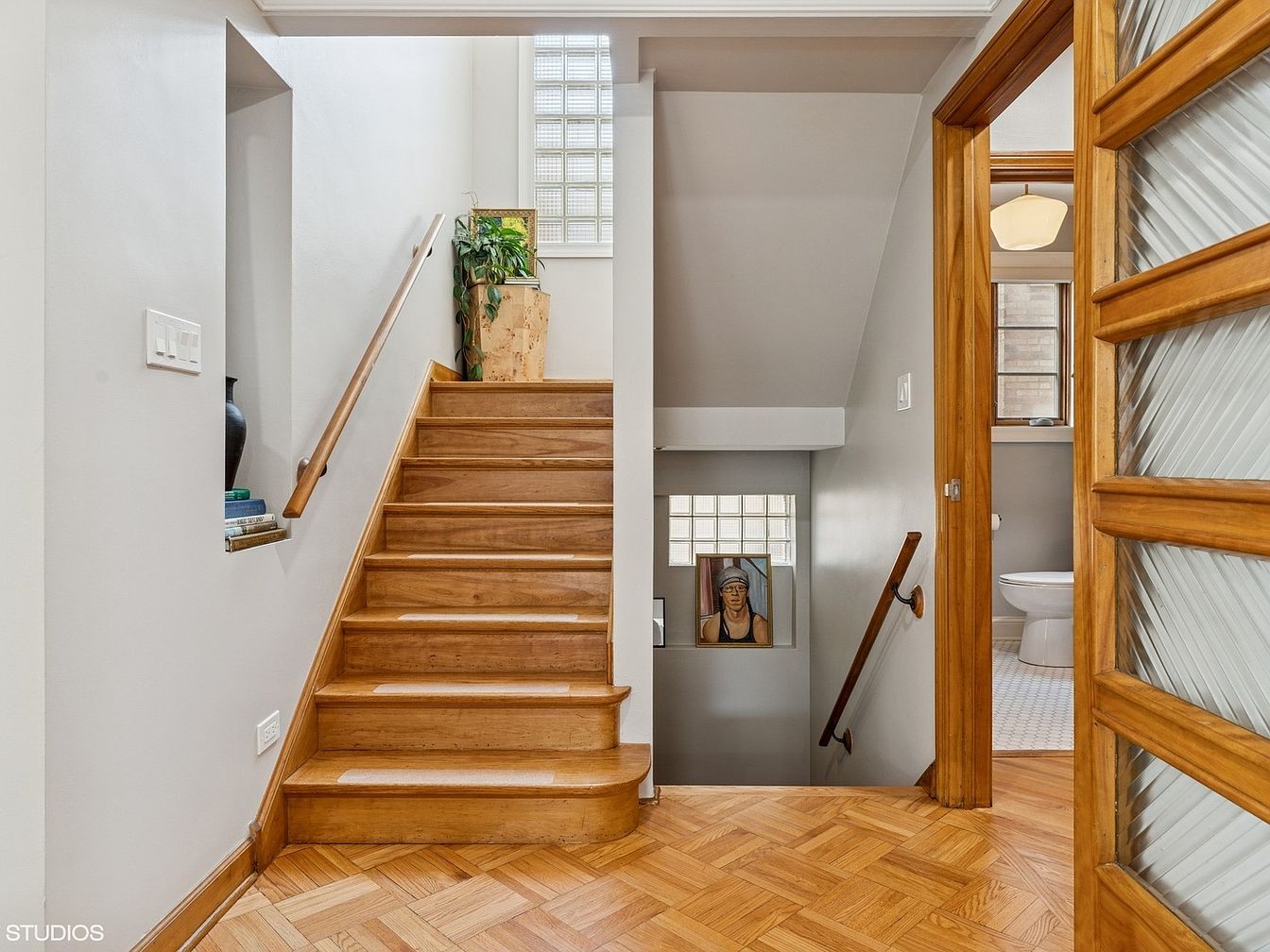 This landing area features warm honey-toned wooden stairs and parquet flooring that contrast beautifully with the soft grayish-white walls. Natural light filters through square glass block windows both above the upper stairwell and beneath the down staircase, illuminating the space gently. A wooden handrail runs alongside each flight of stairs, emphasizing the clean, classic architectural lines. An adjacent room with a textured glass and wooden door reveals a glimpse of a tiled bathroom interior. Decorative touches include a tall textured planter with lush green plants and framed artwork nestled within a recessed wall niche, adding a personalized, inviting feel to this transitional area.