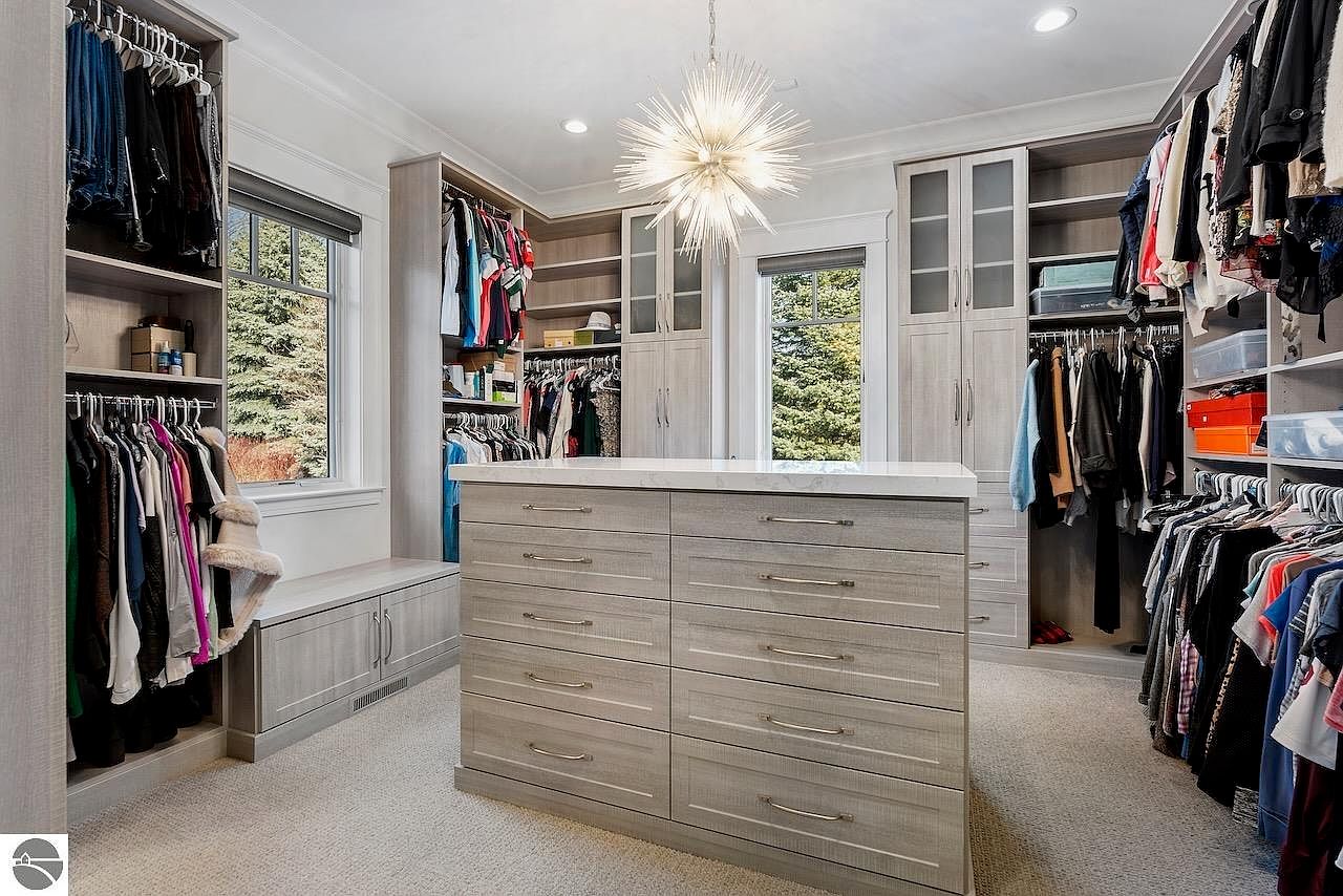 This walk-in closet features a spacious, organized layout with built-in cabinetry in a light gray wood finish, creating a modern and calming aesthetic. Multiple hanging rods are arranged along the walls, maximizing clothing storage, while open shelving holds accessories and boxes. A central island with multiple drawers offers additional concealed storage with a white countertop for folding or display. Two large windows bring in ample natural light, brightening the space and providing views of lush greenery outside. A striking modern chandelier with radiating light fixtures adds an artistic and luxurious touch, enhancing the closet’s contemporary design.