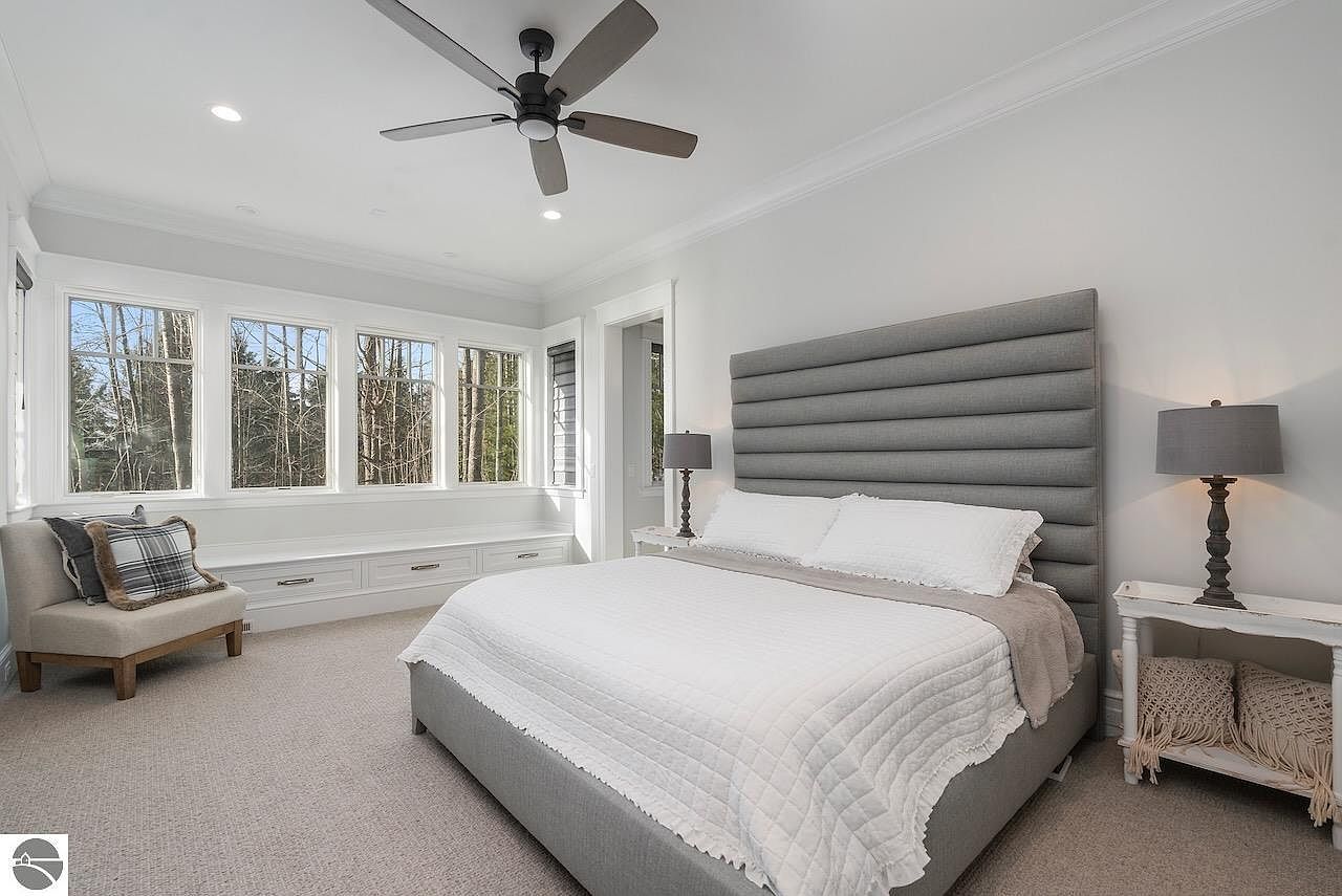 This serene bedroom is designed to maximize natural light and scenic views, featuring large windows that overlook a calm lakeshore. The walls are painted a soft, neutral gray that complements the muted tones of the carpet and furniture, creating a peaceful retreat. The sleigh bed with its upholstered panels offers both style and comfort, dressed in cozy, textured blankets and pillows. A modern black side table and a light gray club chair with a patterned throw add functional accents, enhanced by a round pouf with geometric designs. The ceiling fan adds subtle modernity to the clean, tranquil space.