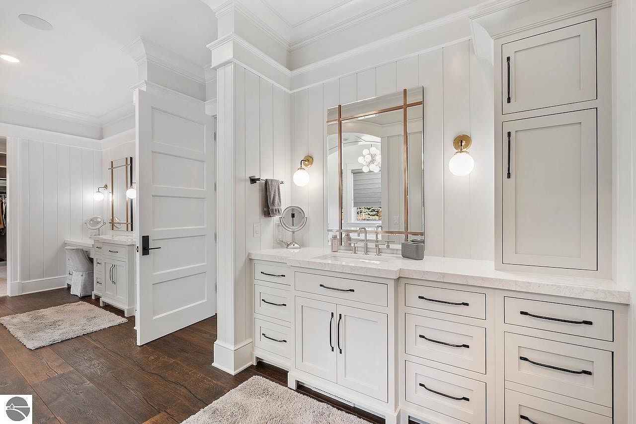 This bathroom vanity area features a clean, white color scheme with vertical shiplap paneling that adds texture and a modern farmhouse charm. The cabinetry is painted white with matte black hardware, offering a striking contrast, and topped with a smooth white marble countertop. A large mirror with a warm bronze frame is flanked by two elegant globe sconces, providing balanced lighting. The flooring is dark hardwood, grounding the space with a rich warmth. An adjacent vanity nook contains a cushioned chair and additional lighting, making this bathroom both functional and inviting with a refined, airy aesthetic.