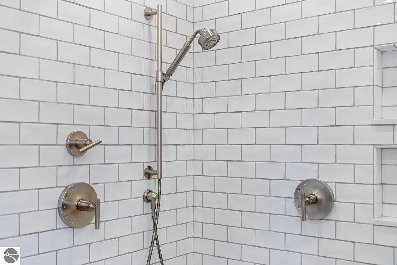 This pristine shower area features classic white subway tiles arranged in a traditional brick pattern, creating a timeless and clean look. The grout lines add subtle contrast, enhancing the tile layout. The shower is equipped with a sleek, brushed nickel handheld showerhead mounted on an adjustable vertical bar for versatile use. Two control handles on either side provide easy water temperature and flow adjustments. A recessed niche built into the tiled wall offers convenient storage for bath essentials, maintaining a minimalist and uncluttered aesthetic throughout the space.