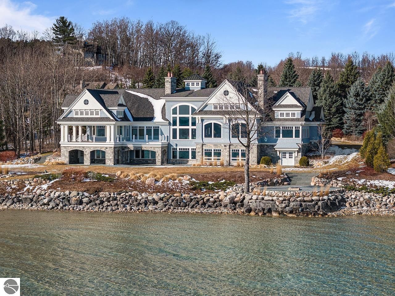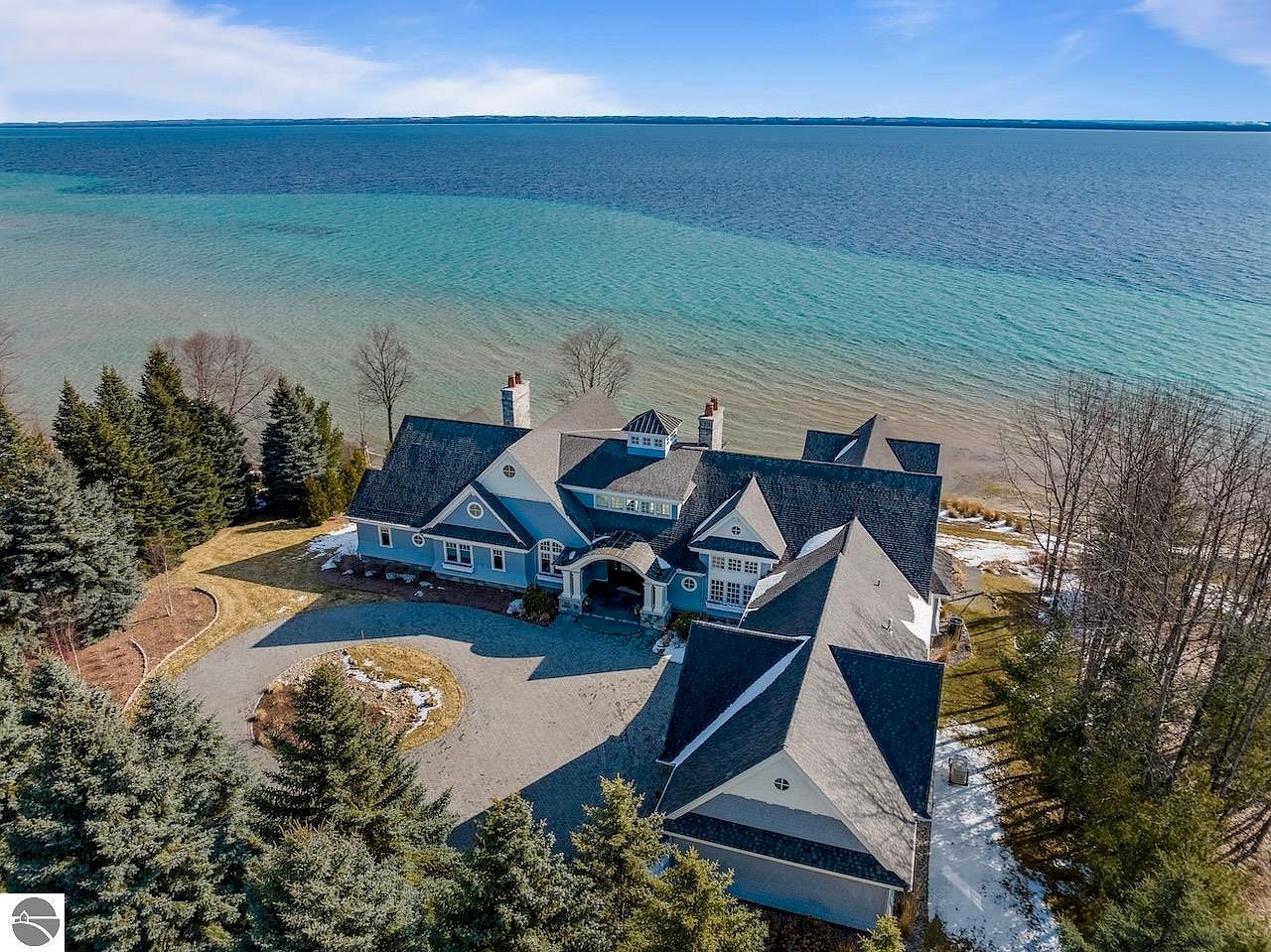 This expansive estate is nestled on the shore with panoramic views of clear blue waters extending to the horizon. The home combines classic and coastal architectural elements, featuring a slate-gray roof with multiple gables and dormers that add character and depth to the structure. The exterior walls are painted a soft blue-gray, complementing the natural surroundings and creating a serene ambiance. Tall evergreens and sparse deciduous trees frame the property, providing privacy and accentuating the circular driveway that leads to a charming covered entrance. This setting harmoniously blends luxury with nature for tranquil waterfront living.