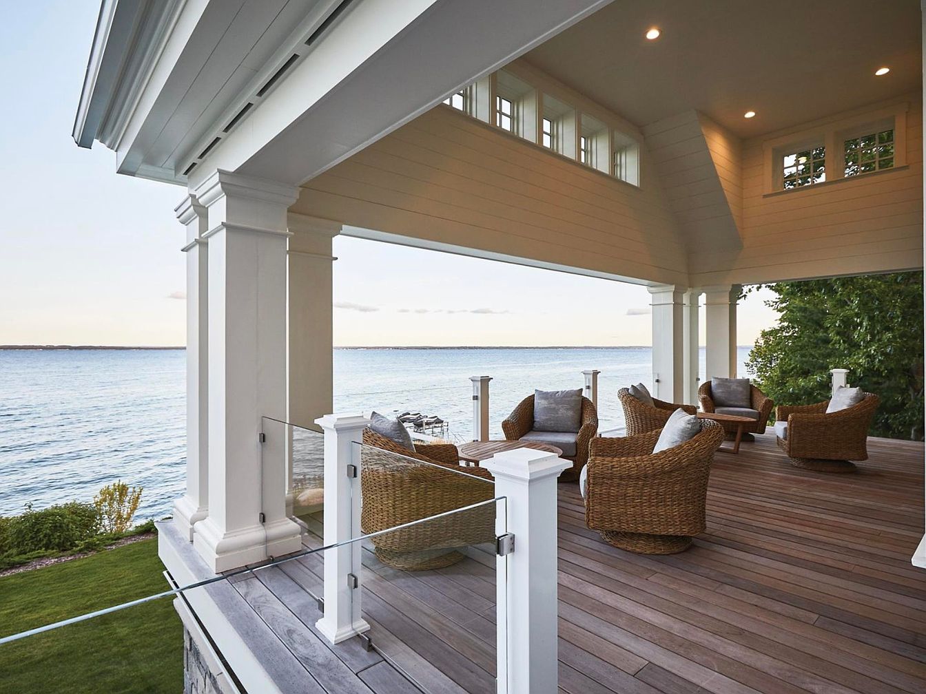 This spacious, covered deck overlooks a serene waterfront, creating a perfect outdoor retreat. It features a natural wood deck floor paired with large white columns and trim that add elegant architectural detail. The ceiling is high and painted in soft beige tones with recessed lighting, giving warmth to the space. Glass railings maintain safety without obstructing the sweeping water views. Comfortable wicker armchairs with cushioned seats invite relaxation, arranged around low wooden tables ideal for casual gatherings. Small upper windows add natural light while preserving privacy. The overall aesthetic is coastal yet refined, blending comfort with timeless style.